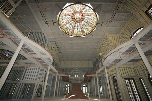 The home opens into a grand hall with symmetrical staircases and a ceiling complete with a stained-glass dome befitting a cathedral. The rest of the mansion is more an outline — only steel beams, insulation and most of the electrical wiring are in place. The two elevator shafts are empty.