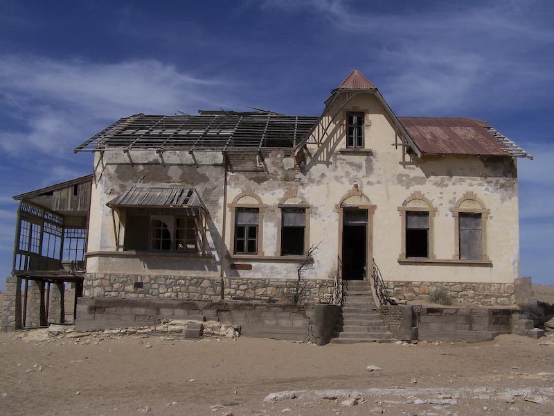 This photo in particular caught my attention. It is a house in Kolmannskuppe, Namibia. Kolmannskuppe was a small town that was created to provide shelter for the workers in the diamond mines in the Namib Desert (stretching 1200 miles in length, but averaging a width of only 70 miles, this desert has some of the highest sand dunes in the world) in 1908. After the diamond prices crashed at the end of World War I, most of the miners left to move to the next “hot” area. The town was officially vacant in 1956.
